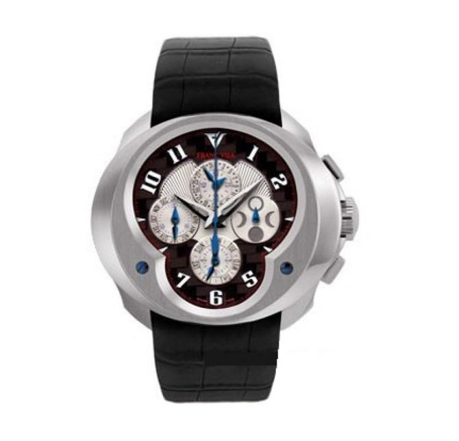 Водостойкие, астрономические швейцарские часы с функцией хронографа от швейцарской часовой мануфактуры Franc Vila. Основатель компании - испанец Френк Вилла. Человек, который начал создавать часовые шедевры после того, как не смог выбрать для себя достойную модель на современном рынке элитных часов. Основная фишка всего модельного ряда Franc Vila - сужающаяся к низу восьмерка или перевернутая восьмерка. Согласно буддистской философии, цифра "8" означает бесконечность и счастье. Данный экземпляр механических часов изготовлен из белого золота (18-каратного). На особенном циферблате, кроме хронографа, осуществляется индикация часов, минут, секунд, даты, дней недели, месяца и фаз Луны. Циферблат закрыт сапфировым стеклом. Модель успешно выполняет широкий набор часовых усложнений на швейцарском мануфактурном часовом механизме с автоподзаводом, Калибр FV 9. В комплекте идет ремешок из натурального каучука или натуральной кожи крокодила с раскладывающейся застежкой, материал изготовления которой идентичен материалу корпуса. Кнопки хронографа размещены между завинчивающейся заводной головкой. Корпус герметичен до 100 метров глубины. Производство осуществляется лимитированной серией из 88 экземпляров.