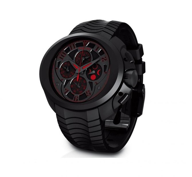 Астрономические водостойкие наручные часы с функцией хронографа представлены в корпусе из титана и композита "карбон-графен". На многофункциональном циферблате, выполненном в традиционном стиле бренда Franc Vila, индицируются такие функции: часы, минуты, секунды, дата, день недели, месяц и фаза Луны. Последнее часовое усложнение делает модель швейцарских часов - астрономической. Водостойкой ее делает - 100-метровая герметичность корпуса, а функция хронографа делает часы спортивными. Внутри корпуса размещено сердце часов - их механизм, Калибр FV9, работающий от автоматического подзавода. Запас хода механических часов - 42 часа. В комплекте - каучуковый ремешок с раскладывающейся застежкой. Стоит отметить, что модель выпускается ограниченной серией - всего 88 экземпляров.