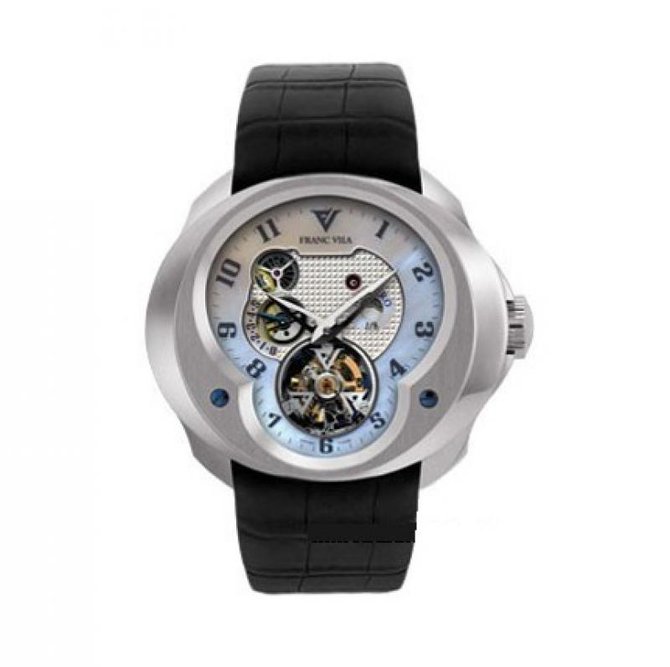 Часовая мануфактура из Швейцарии Franc Vila, основанная испанским часовщиком Френком Виллой, представила механические наручные часы с функцией турбийона - Tourbillon Planetaire White Gold, функционирующие на мануфактурном механизме с ручным подзаводом, Калибр FRANC VILA No.1. Довольно крупный корпус сложной формы изготовлен из 18-каратного белого золота. Раскладывающаяся пряжка также выполнена из белого золота. Модель швейцарских часов Tourbillon Planetaire White Gold, как правило, комплектуется двумя видами ремешков - из прочного каучука и из натуральной крокодильей кожи. На текстурированном циферблате часов размещены: окошко турбийона, стрелки для индикации часов и минут, индикатор уровня запаса хода, который в механизме FRANC VILA No.1 составляет 120 часов (5 суток). Циферблат находится под надежной защитой сапфирового стекла. Водостойкость золотого корпуса - 100 метров. Лимитированный тираж - 8 моделей в год.