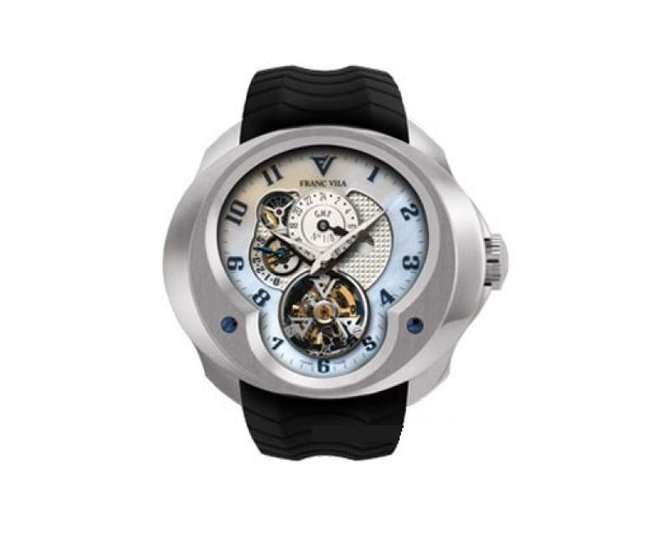 Основные часовые усложнения представленной модели - это турбийон, окно которого расположено на циферблате часов, и функция двойного времени (функция GMT). Обычно, модель FVa №2 комплектуется ремешком из натуральной кожи аллигатора или натурального каучука с раскладывающейся застежкой. Мужские швейцарские наручные часы Montre Contemporaine Grande Complication FVa №2 от швейцарской часовой мануфактуры Franc Vila вышли в корпусе из белого 18-каратного золота. Водонепроницаемость корпуса - 100 метров. Лимитированный тираж - всего 8 экземпляров в год. Запас хода механизма FV No.2 TV - 5 дней (120 часов). Состояние запаса хода указывается на циферблате с помощью специального индикатора. Кроме индикатора запаса хода, на циферблате расположены стрелки-указатели часов и минут. Механизм: швейцарский мануфактурный калибр FV No.2 TV функционирует от ручного подзавода и отмечен официальным сертификатом C.O.S.C. (швейцарский институт хронометрии) в качестве хронометра.