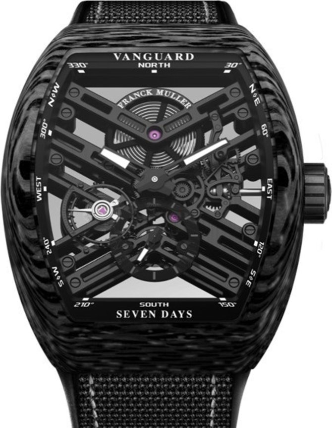 Карбоновый корпус, диаметром 44 x 53.7 мм, крепится на руке тканевым ремешком черного цвета и застежкой классического типа из нержавеющей стали. Стрелки наручных часов обладают высокой читабельностью в темноте благодаря люминесцентному покрытию. Корпус бочкообразной формы рассчитан на погружение под воду до 30 метров глубины. Модель Vanguard Skeleton V 45 S6 SQT CARBONE NR от швейцарской компании Franck Muller работает от мануфактурного калибра с автоматическим подзаводом и запасом хода на 2 суток. Циферблат защищен надежным, выпуклым вперед, сапфировым стеклом с противобликовым эффектом.
