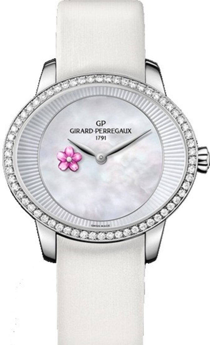 В корпусе из нержавеющей стали, размером 35.4 х 30.4 х 9.21 мм, была презентована модель швейцарских часов Girard-Perregaux Cat`s Eye Plum Blossom 80484D11A701-HK7A. Циферблат овальной формы из натурального перламутра, украшенный цветком сливы, закрыт стеклом из сапфирового кристалла. На циферблате показываются данные часов и минут. Установленный калибр GP03300-0150 является мануфактурной разработкой Girard-Perregaux. Запас хода механизма рассчитан на 46 часов. Водонепроницаемость корпуса находится на базовом уровне - 30 метров. Безель украшен белыми бриллиантами классической огранки.