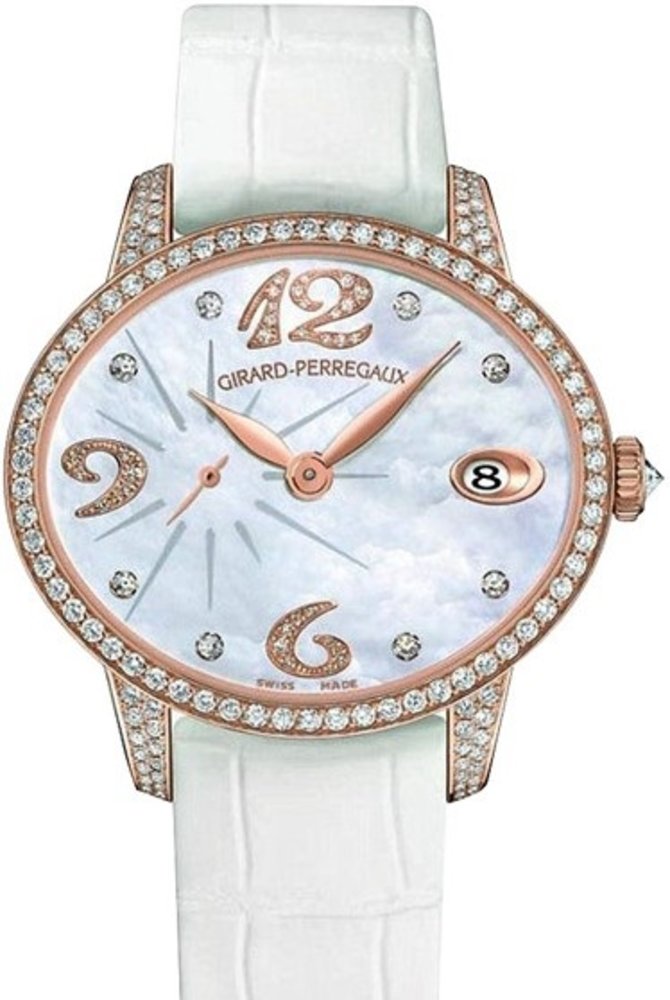 Женские наручные часы Girard-Perregaux Cat`s Eye Small Second 80484D52P762BK7A в корпусе из розового золота с инкрустацией бриллиантами вошли в ювелирную коллекцию Cat's Eye. Корпус выполнен в овальной форме. Циферблат из натурального перламутра с часовыми метками из бриллиантов. Стрелки из розового золота. Цифры 6, 9, 12 декорированы бриллиантами. Сапфировое стекло с антибликовым покрытием накрывает ювелирный циферблат. Автоматический Калибр GP 3300-0044 мануфактурного производства Girard-Perregaux отвечает за индикацию часов, минут, секунд и дата. Запас хода - 46 часов. Размеры корпуса идеально подходят для женского запястья - 35.25 х 30.25 х 9.1 мм. Еще один крупный драгоценный камень украшает и заводную головку часов. Часы комплектуются ремешком из крокодиловой кожи нежно-белого цвета.