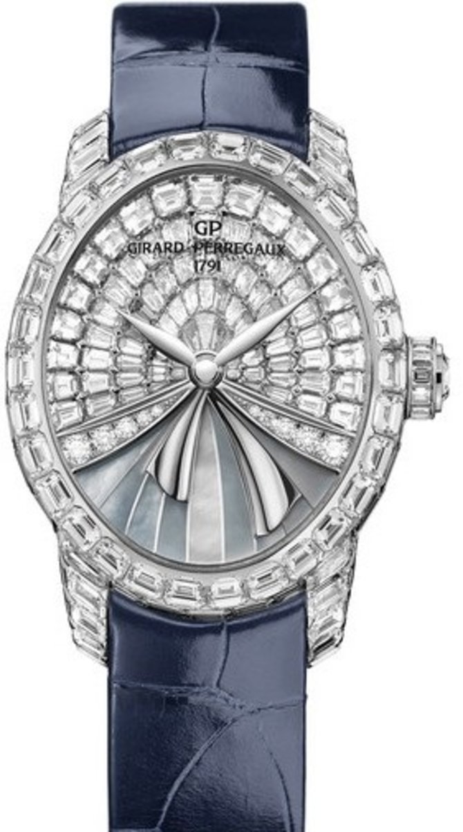 Швейцарская часовая марка Girard-Perregaux представляет ювелирное творение в виде наручных механических часов для женщин.Корпус часов исполнен в форме яйца из белого 18-каратного золота. В качестве украшения корпуса и циферблата применялись белые багетные бриллианты. Стрелками из белого золота в форме листьев показываются данные часов и минут. Стекло, которым покрывается циферблат, из сапфирового кристалла с антибликовыми свойствами. Ремень, который идет в комплекте вместе с золотой застежкой, пошит из натуральной кожи аллигатора в синем цвете. Водонепроницаемость корпуса составляет 30 метров. В часах установлен автоматический мануфактурный часовой калибр с длительным запасом хода от компании Girard-Perregaux.