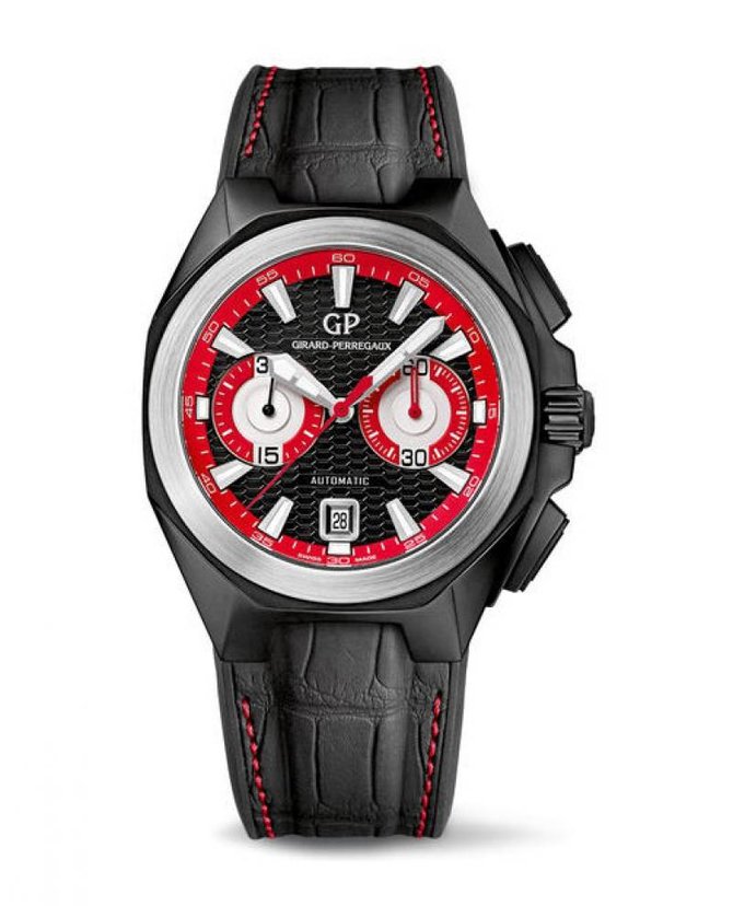 Мужские наручные механические часы представлены известным часовым брендом Girard Perregaux в массивном корпусе сложной формы, изготовленном из керамики. Сердце часов - их механизм, функционирует от автоматического подзавода. Запас хода - 46 часов. Количество камней в механизме - 61. Балансовая частота - 28800 полуколебаний в час (4 гц). Диаметр корпуса - 44 миллиметра; толщина - 15.5 миллиметров. Главная техническая особенность модели - функция хронографа. На циферблате указываются данные часов, минут, секунд и даты, а также размещены счетчики хронографа. Герметичность корпуса представленной модели - 100 метров. Калибр GP3300-0076 является полностью мануфактурным, то есть разработанным и собранным в стенах мануфактуры Girard-Perregaux. Пушеры хронографа традиционно расположены возле меток 2 и 4 часов, окружая рифленую завинчивающуюся заводную головку. Сапфировое стекло установлено на лицевой стороне корпуса и на месте задней крышки. С лицевой стороны - с нанесением антибликового покрытия. С задней - завинчивающееся. При изготовлении циферблата применялось фото-люминесцентное покрытие, светящееся в темное время суток.