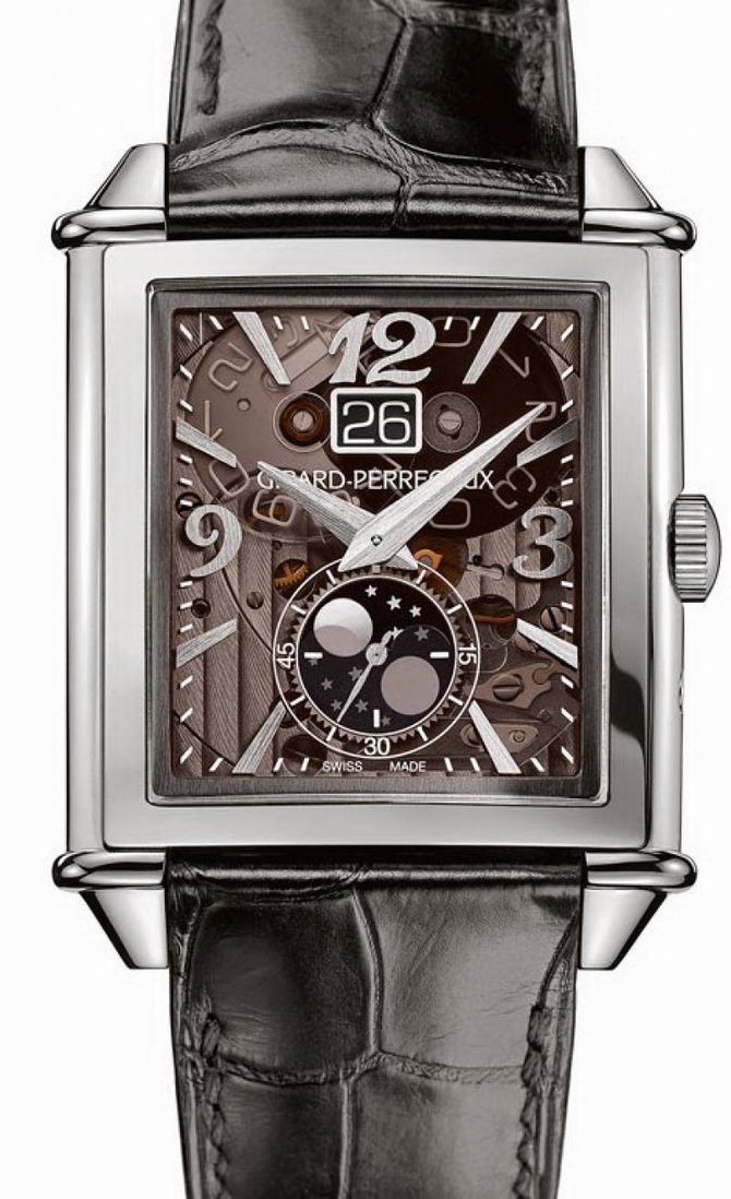 Girard-Perregaux презентует свою новинку 2014 года - астрономические часы Vintage 1945 XXL Large Date Moon Phase. Модель вышла в прочном корпусе из высокопрочной нержавеющей стали. Скелетонизированный прозрачный циферблат обладает крупным указателем даты около 12-ти часовой отметки и суб-циферблатом для отображения фазы Луны около 6-ти часовой отметки. Часовой механизм модели защищен сапфировым стеклом серого тонирующего оттенка. Механизм часов с автоматическим заводом, обладающий модулем для усложнений. Его частота составляет 4 Гц, что = 28 800 пк/час; запас хода - 46 часов. Конечно же, мы можем за ним наблюдать через сапфировое стекло обратной стороны корпуса. В комплекте с часами идет ремешок из кожи крокодила черного цвета со стальной пряжкой. Окошко для индикации даты оснащено увеличительным стеклом.