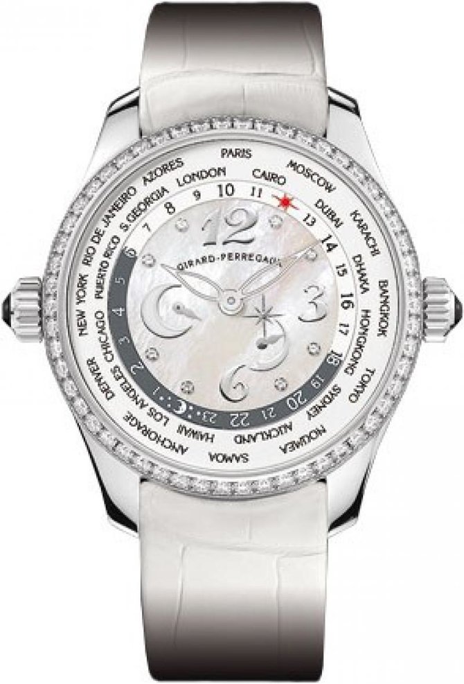 Великолепную модель женских швейцарских часов представляет компания Girard-Perregaux в комбинации стального корпуса и браслета из кожи крокодила. Особенностями часов является: водонепроницаемость 50 м, время 24-х городов мира, безель из 54-х белых бриллиантов 1.95 ct., заводные ключи инкрустированы черными ониксами кабошонами.
