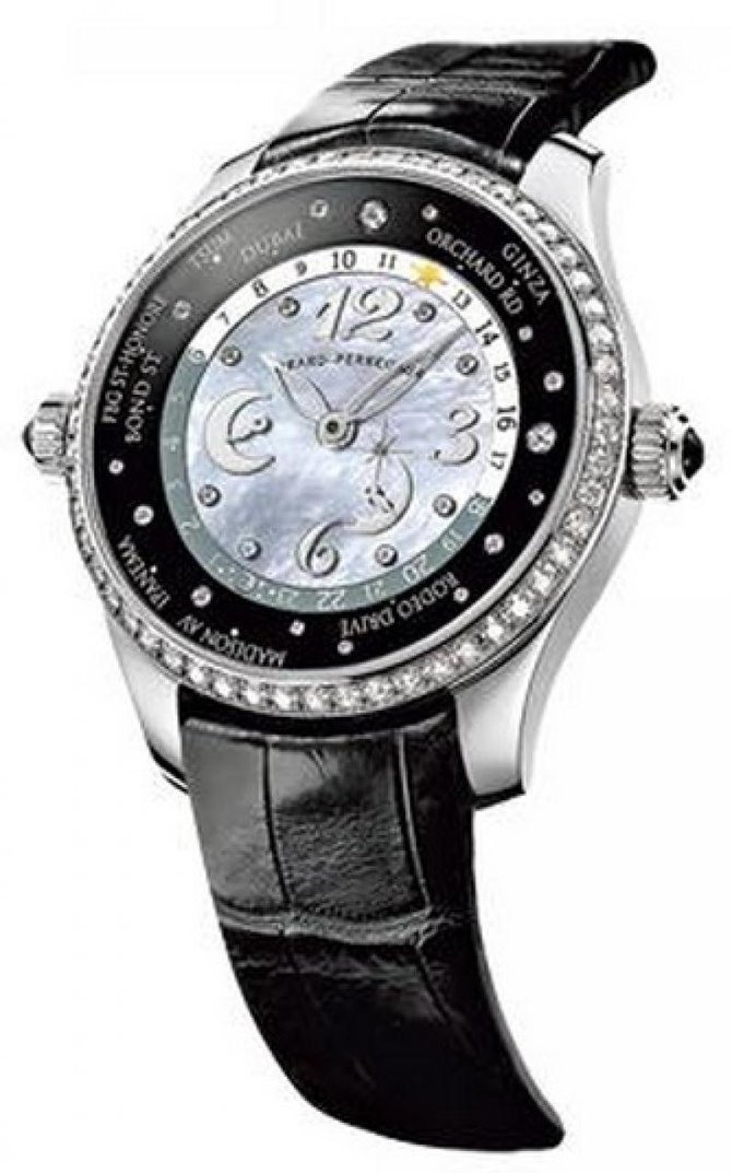 Великолепную модель женских швейцарских часов представляет компания Girard-Perregaux в комбинации стального корпуса и браслета из кожи крокодила. Особенностями часов является: водонепроницаемость 50 м, вращающийся внутренний безель инкрустирован 15-ю бриллиантами 0.18 ct., безель из 54-х белых бриллиантов 1.95 ct., заводные ключи инкрустированы черными ониксами кабошонами; 23 белых бриллианта 0.3 ct. на циферблате; запас хода, shopping-time с указателем день/ночь.