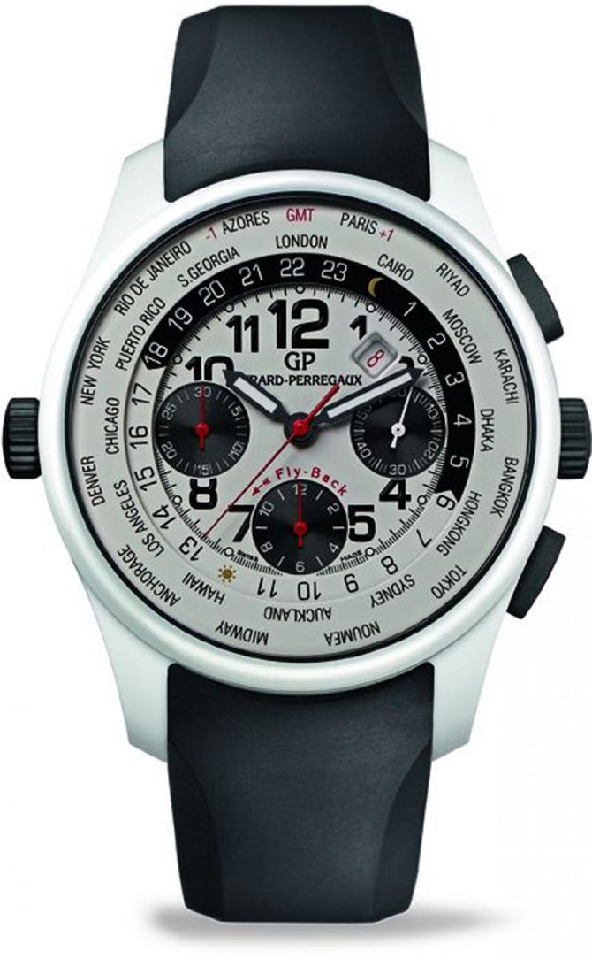 Мужские швейцарские часы Girard-Perregaux Traveller (ww.tc) ww.tc Chronograph White Ceramic 49820-32-712-FK6A - механизм автоматический, калибр GP3300-0028, запас хода 46 часов, корпус из титана и керамики, браслет каучуковый, водостойкие, двойное время, хронограф, время 24-х городов мира.