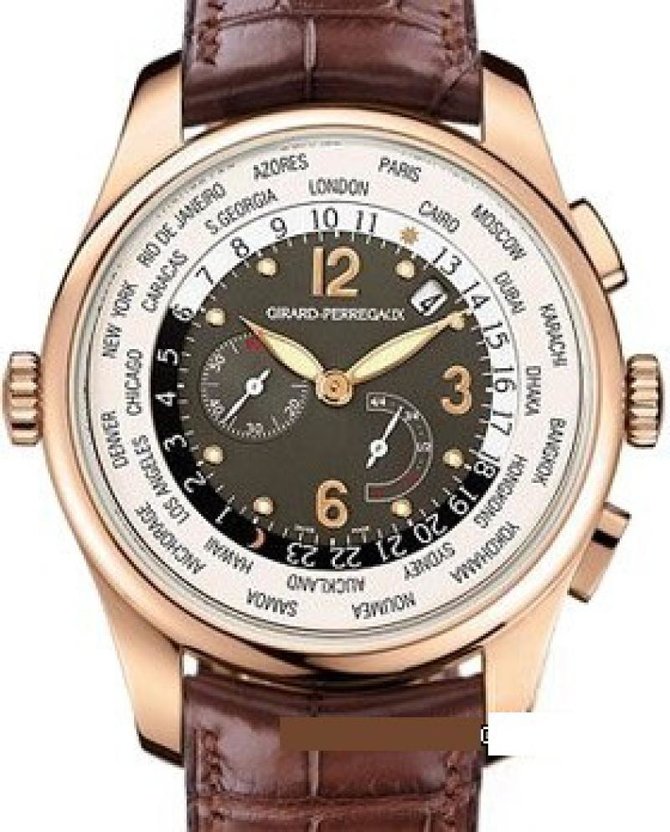 Элегантные швейцарские часы Girard-Perregaux Traveller ww.tc представлены в комбинации золотого корпуса и браслета из кожи крокодила, механизм автоматический; особенности модели - водостойкие, двойное время, время 24-х городов мира; запас хода - 46 часов.
