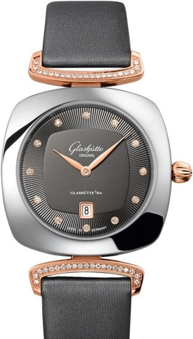 Роскошные женские часы Ladies Collection Pavonina 1-03-01-25-16-34 подготовила для ценителей высокого часового мастерства швейцарская компания Glashutte Original. На циферблате серого цвета с гильошированными зонами установлены бриллианты в качестве часовых меток, а также стрелки из натурального золота, показывающие владельцу точное время. Корпус в форме подушки сделан из нержавеющей стали и розового золота. Ремешок серого цвета пошит из сатина. Застежка, что его дополняет, выполнена из стали. Ушки на корпусе для фиксации ремешка инкрустированы бриллиантами. Механизм кварцевого типа, расположенный внутри комбинированного корпуса, собран на базе мануфактуры Glashutte Original.
