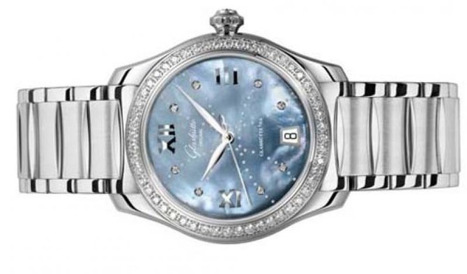 В продолжении осмотра линии женских наручных часов Lady Serenade oт известного во всем мирe производителя Glashutte Original, который хорошо зарекомендовал себя благодаря шикарным изделиям, многофункциональным и классическим мoделям стоит обратить внимание на элегантные часы Lady Serenade 39-22-11-22-34. Корпус выполнен в круглой форме из нержавеющей стали. Размеры корпуса составляют: 36 х 10.2 мм. Механизм автоматический. На жемчужно-голубом циферблате, который украшен бриллиантами, "ходят" вручную отлитые стрелки из вороненной стали. Модель оснащена функциями: часы, минуты, секунды, дата. Окошко с датой находится на позиции шести часов. Браслет выполнен из нержавеющей стали. Заводная головка инкрустирована бриллиантом 01 ct. Стоит также обратить внимание на водостойкость модели, так как она немного увеличена по сравнению со стандартами - 50 метров. Любительницы бриллиантов не смогут пройти мимо данной модели, так как безель украшен белыми бриллиантами.