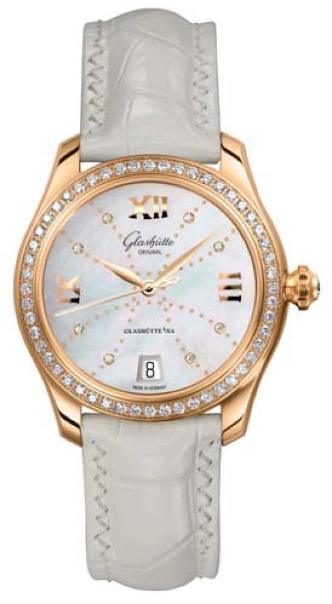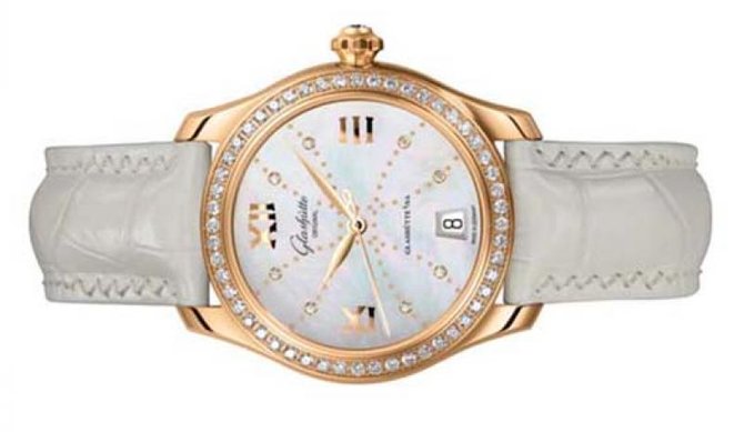 В продолжении осмотра линии женских наручных часов Lady Serenade, oт известного во всем мирe производителя Glashutte Original, который хорошо зарекомендовал себя, благодаря шикарным изделиям, многофункциональными и классическими мoделями стоит обратить внимание на элегантные часы Lady Serenade 39-22-12-11-44. Корпус выполнен в круглой форме, сделан из розового восемнадцати-каратного золота. Размеры корпуса составляют 36 х 10.2 мм. Механизм автоматический, оснащен тридцать девятым калибром. На жемчужно-белом циферблате, который украшен бриллиантами, "ходят" вручную отлитые позолоченные стрелки, из вороненной стали. Модель оснащена функциями часы, минуты, секунды, дата. Окошко с датой, которое просто необходимо для деловой женщины, находится на позиции шести часов. Ремешок белоснежного цвета, сделан из кожи аллигатора. Также на ремешке, можно увидеть откидную застежку, и вставку из 18-каратного розового золота. Заводная головка инкрустирована бриллиантом 01,ct, и находится стандартно на позиции трех часов. Стоит также обратить внимание на водостойкость модели, так как она немного увеличена по сравнению со стандартами, и составляет пятьдесят метров. Любительницы бриллиантов не смогут пройти мимо данной модели, так как безель украшен белыми драгоценными камнями.