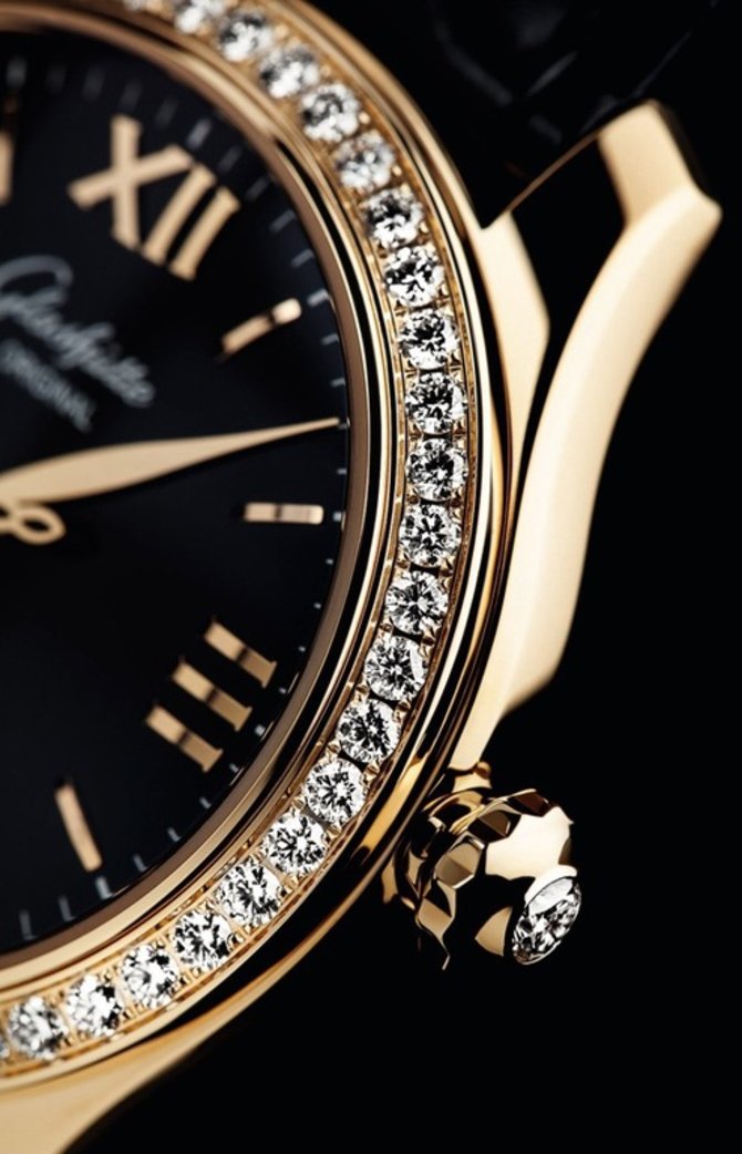 В круглом корпусе из розового 18-каратного золота, который украшен большим количеством бриллиантов, инженеры мануфактуры Glashutte Original разместили Калибр 39-22, функционирующий от автоподзавода и владеющий 40-часовым запасом хода. Кроме корпуса, драгоценный камень украшает и заводную головку часов, рифленую для минимизации скольжения пальцев. На строгом циферблате черного цвета находятся золотые стрелки и накладные часовые метки, сделанные из золота. Сапфировое стекло с нанесением антибликового покрытия отвечает за сохранность циферблата. Элегантный ремешок из натуральной крокодиловой кожи и раскладная золотая застежка - в комплекте. Корпус обладает 50-метровой водонепроницаемостью. Общий вес бриллиантов - 1.09 ct. Общее количество драгоценных камней - 52.