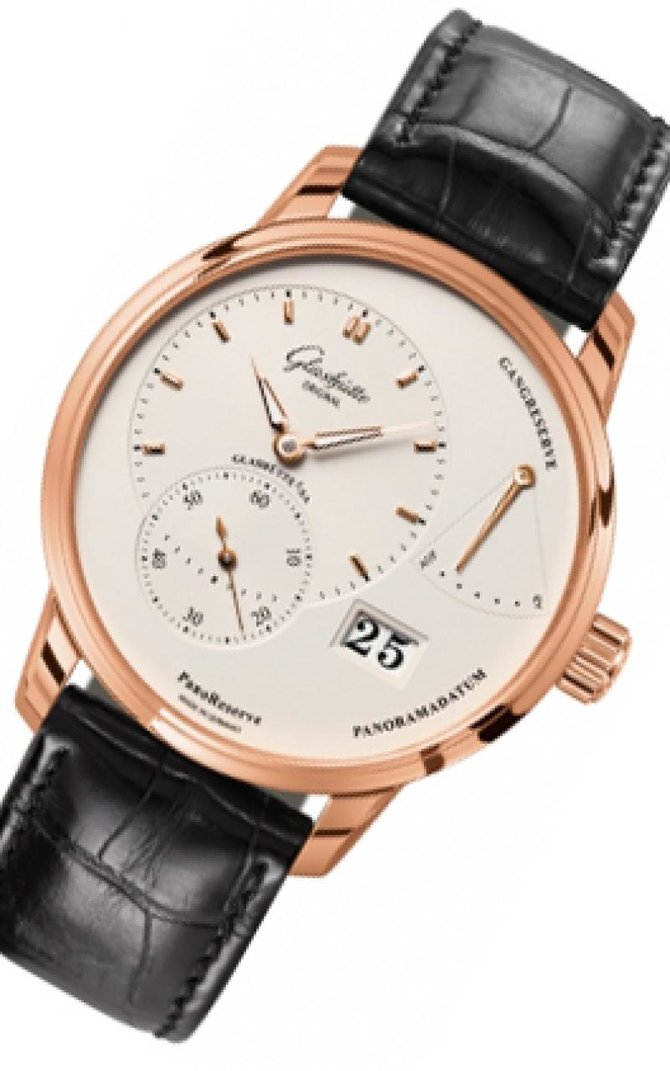 На очереди к осмотру модель мужских наручных часов PanoReserve 1-65-01-25-15-04, от производителя Glashutte Original, чье имя известно на весь мир, благодаря шикарным часовым изделиям. От предыдущей модели 1-65-01-23-12-04 , эти часы отличаются только материалом корпуса и цветом циферблата. Данная модель заинтересует любителей простых классических дизайнов, а главное надежности и самое главное функциональности. Корпус часов круглой формы, сделан из 18-каратного розового золота. Диаметр корпуса равен 40 мм. Автоматический механизм оснащен калибром Glashutte Original 65-01, и имеет запас хода на 42 часа. На выпуклом циферблате серебристого цвета, "ходят" отлитые вручную, из вороненной стали стрелки. Шкала разбита на 12 и 60 делений. Ремешок черного цвета, сделан из кожи аллигатора. На ремешке можно увидеть застежку из розового золота. Водостойкость данной модели немного увеличена по сравнению со стандартной, и составляет 50 метров. Благодаря прочным сапфировым стеклам, можно не переживать на счет царапин и прочих повреждений. Также открывается взгляд на работу механизма через заднюю прозрачную сапфировую крышку. И конечно же самая главная особенность данной модели это увеличенная дата. Индикатор даты находится на позиции между четырьмя и пятью часами.