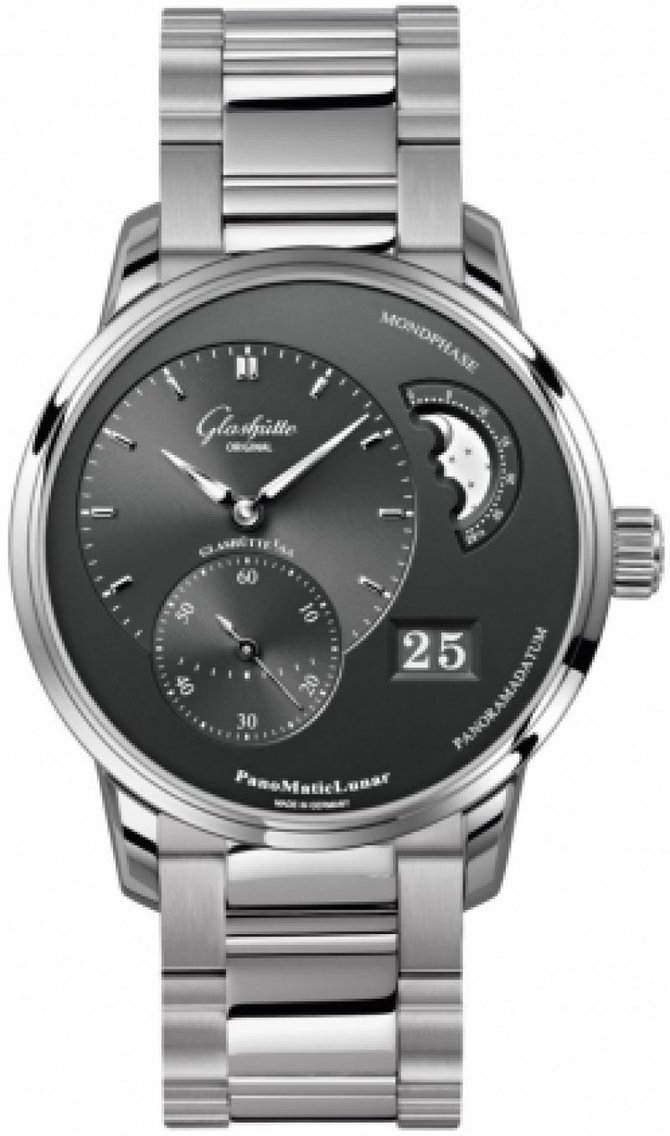 На очереди к осмотру модель мужских наручных часов PanoMaticLunar 40 mm 1-90-02-43-32-24, от производителя Glashutte Original, чье имя известно на весь мир, благодаря шикарным часовым изделиям. Данная модель заинтересует любителей простых классических дизайнов, а главное надежности и самое главное функциональности. Основное отличие этих часов от предыдущей модели 1-90-02-43-32-05 заключается в том, что здесь вместо ремешка, представлен стальной браслет. Корпус часов круглой формы, сделан из нержавеющей стали. Диаметр корпуса равен 40 мм. Автоматический механизм оснащен калибром Glashutte Original 90-02, и имеет запас хода на 42 часа. На выпуклом циферблате черного цвета, "ходят" посеребренные и отлитые вручную стрелки. Шкала разбита на 12 и 60 делений. Браслет данной модели полностью сделан из нержавеющей стали. Водостойкость данной модели немного увеличена по сравнению со стандартной, и составляет 50 метров. Благодаря прочным сапфировым стеклам, можно не переживать на счет царапин и прочих повреждений. Также открывается взгляд на работу механизма через заднюю прозрачную сапфировую крышку. И конечно же самая главная особенность данной модели это увеличенная дата. Индикатор даты находится на позиции немного выше шести часов. Ещё одна приятная неожиданность данной модели, это отображение фаз луны. Индикатор находится на позиции одного часа.