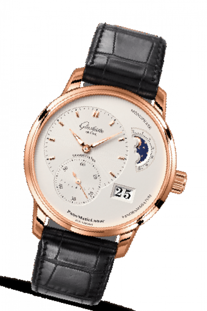 На очереди к осмотру модель мужских наручных часов PanoMaticLunar 40 mm 1-90-02-45-35-05, от производителя Glashutte Original, чье имя известно на весь мир, благодаря шикарным часовым изделиям. От предыдущих часов , эти отличаются материалом корпуса а также цветом циферблатов. Данная модель заинтересует любителей простых классических дизайнов, а главное надежности и самое главное функциональности. Корпус часов круглой формы, сделан из 18-каратного розового золота. Диаметр корпуса равен 40 мм. Автоматический механизм оснащен калибром Glashutte Original 90-02, и имеет запас хода на 42 часа. На выпуклом циферблате серебристого цвета, "ходят" позолоченные и отлитые вручную стрелки. Шкала разбита на 12 и 60 делений. Ремешок черного цвета, сделан из кожи аллигатора. На ремешке можно увидеть застежку из 18-каратного розового золота. Водостойкость данной модели немного увеличена по сравнению со стандартной, и составляет 50 метров. Благодаря прочным сапфировым стеклам, можно не переживать на счет царапин и прочих повреждений. Также открывается взгляд на работу механизма через заднюю прозрачную сапфировую крышку. И конечно же самая главная особенность данной модели это увеличенная дата. Индикатор даты находится на позиции немного выше шести часов. Ещё одна приятная неожиданность данной модели, это отображение фаз луны. Индикатор находится на позиции одного часа.