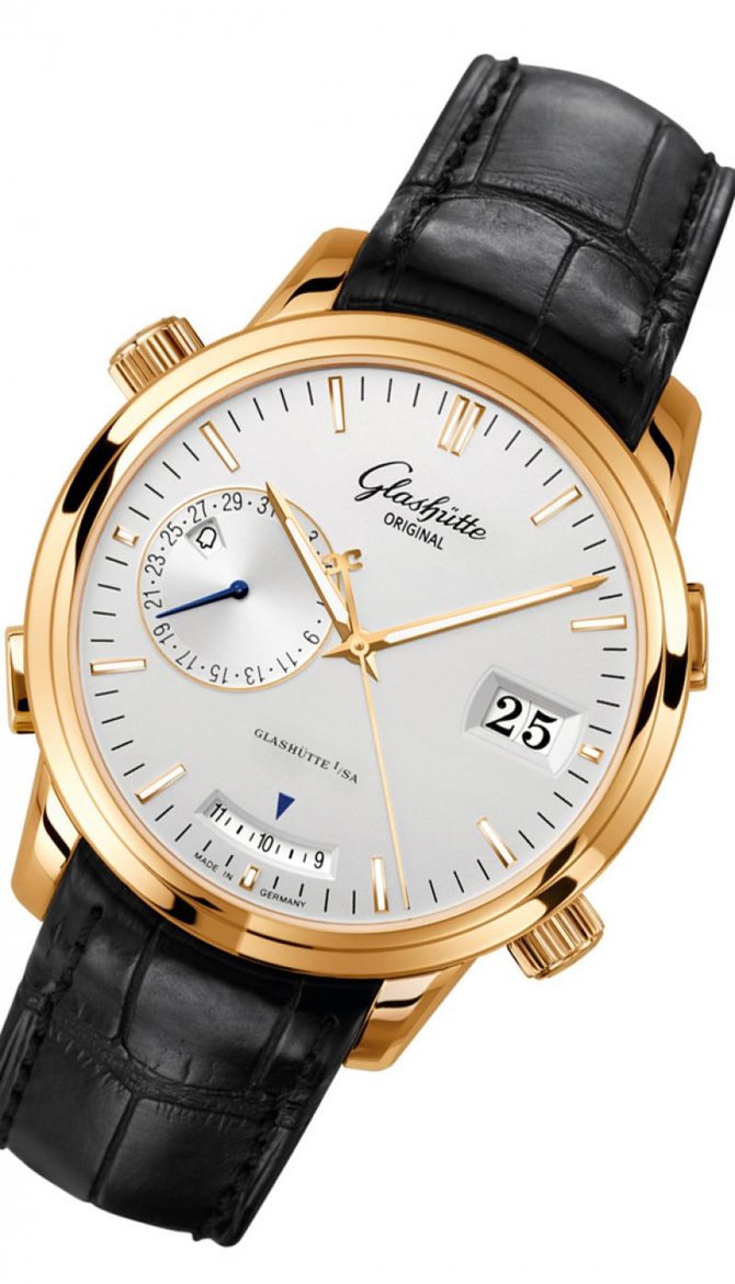 На очереди к осмотру модель мужских наручных часов Senator Diary 100-13-01-01-04, от производителя Glashutte Original, чье имя известно на весь мир, благодаря шикарным часовым изделиям. Данная модель заинтересует любителей простых классических дизайнов, а главное надежности и самое главное функциональности. Корпус часов круглой формы, сделан из розового восемнадцати каратного золота. Диаметр корпуса равен 42 мм. Автоматический механизм оснащен калибром Glashutte Original 100-13, и имеет запас хода на 55 часов. На выпуклом циферблате серебристого цвета, "ходят" отлитые вручную, из вороненной стали золотистые стрелки. Шкала разбита на 12 и 60 делений. Ремешок черного цвета, сделан из кожи аллигатора. На ремешке можно увидеть застежку из розового золота в восемнадцать карат. Водостойкость данной модели немного увеличена по сравнению со стандартной, и составляет 50 метров. Благодаря прочным сапфировым стеклам, можно не переживать на счет царапин и прочих повреждений. Также открывается взгляд на работу механизма через заднюю прозрачную сапфировую крышку. И конечно же самая главная особенность данной модели это увеличенная дата. Индикатор даты находится на позиции трех часов. Также модель обладает функцией будильника.
