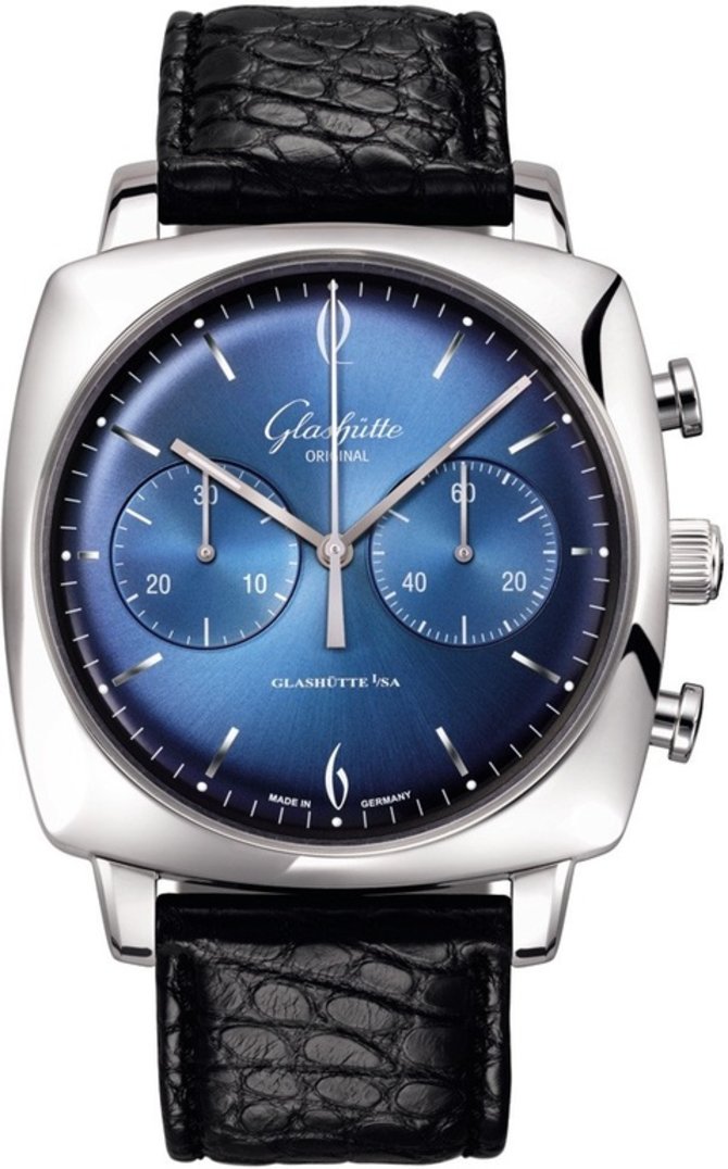 Подушкообразный хронограф от Glashutte Original, основанный на платформе калибра 39-34. Часы со скелетонированным ротором автоподзавода, полосой и логотипом с двойной буквой G, скошенными краями, полированными стальными частями. Хронограф Sixties Square дебютировал в 2009 году как современная версия хронографов 1960-х годов. В 2017 году Glashütte Original создали ряд версий с экзотическими цветами, подобными тем, которые выпускались в шестидесятых годах прошлого века. Круглый циферблат накрывается сапфировым стеклом. Ремешок, что в комплекте, пошит из кожи луизианского аллигатора черного цвета. Водонепроницаемость корпуса - 30 метров.