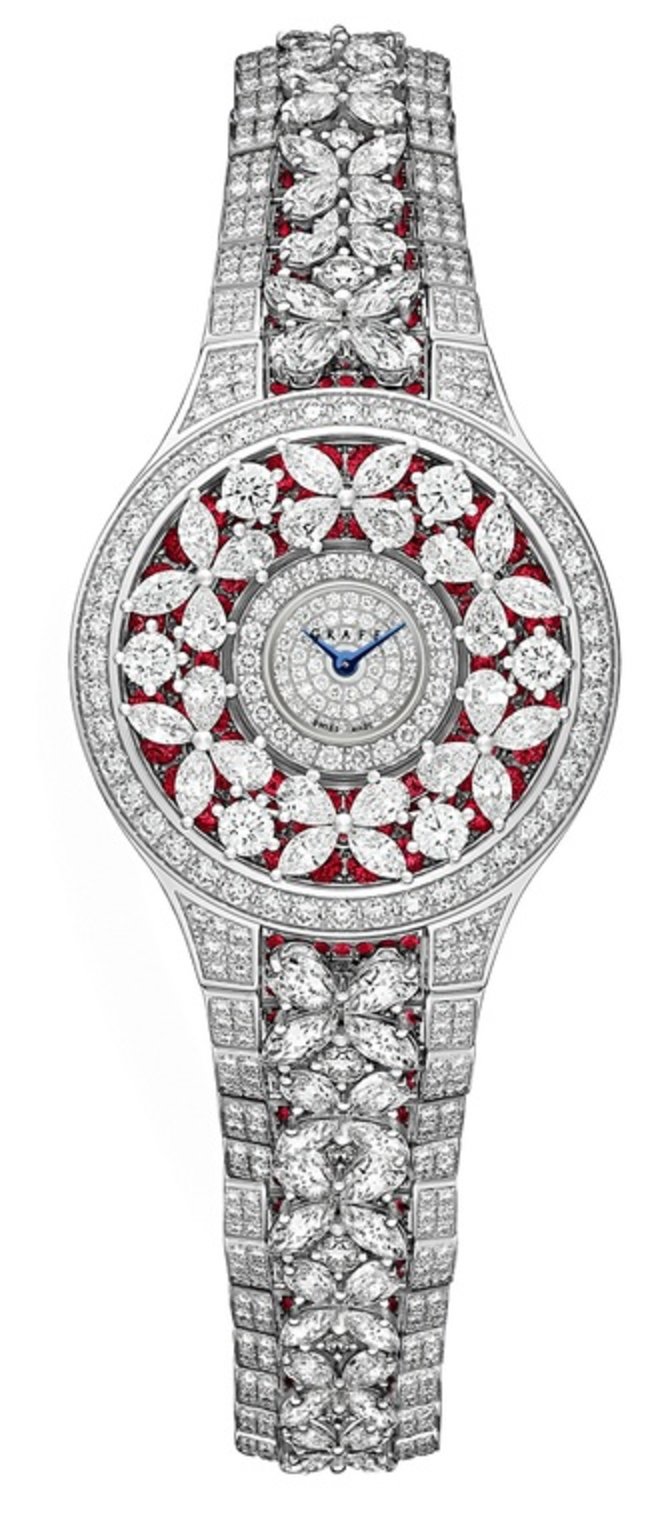 Часовой бренд GRAFF представил модель часов BF32WGDRDR Butterfly Classic Butterfly в корпусе из белого золота круглой формы с браслетом из белого золота в комплекте с раскладной пряжкой. Корпус, циферблат и браслет инкрустированы бриллиантами и рубинами. На циферблате показываются часы и минуты. Установленный кварцевый калибр разработан на мануфактуре GRAFF. Водонепроницаемость корпуса - 30 метров. Циферблат защищен сапфировым кристаллом.