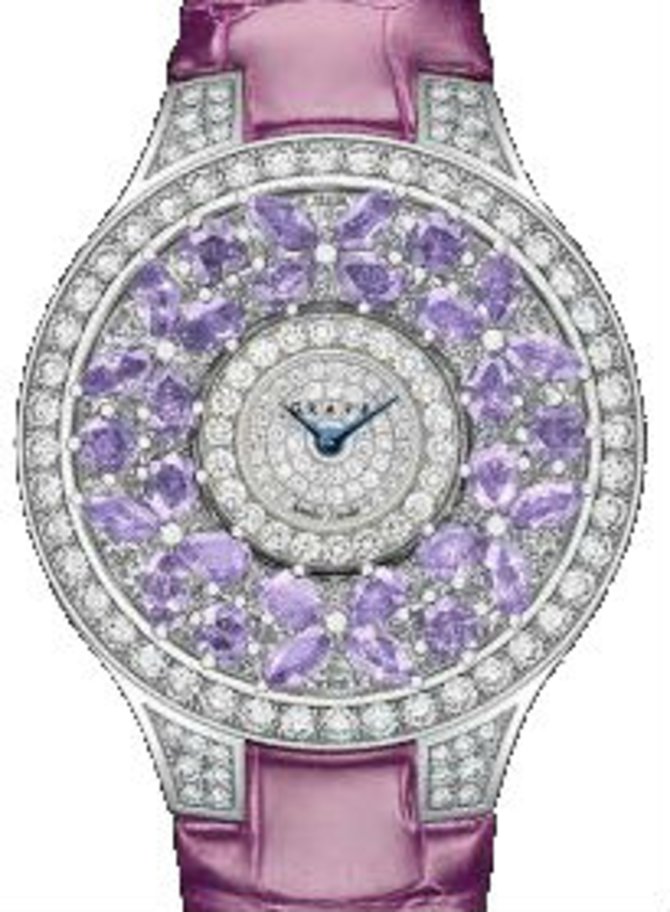 Часовая марка GRAFF представляет ювелирные часы для женской половины населения планеты - Butterfly Classic Ref. Full Motif Violet Sapphire, что представлены в корпусе круглой формы из белого золота с инкрустацией множеством белых бриллиантов, а также фиолетовыми сапфирами. Внутри искусного корпуса размещен кварцевый механизм от инженеров марки GRAFF. На бриллиантовом циферблате указываются данные часов и минут с помощью вороненых стрелок синего цвета. Стекло, которым накрыт циферблат, выполнено из сапфирового кристалла. Модель укомплектована ремешком из кожи аллигатора розового цвета и классической пряжкой из белого золота. Размер корпуса: 32 мм в диаметре и 9 мм в толщину.