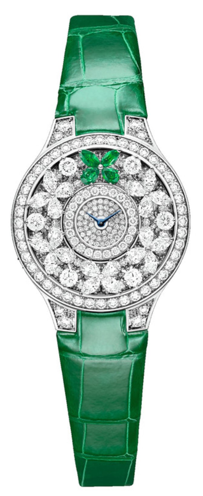 Кварцевые часы для женщин в корпусе из белого 18-каратного золота, диаметром 32 мм, полностью инкрустированном бриллиантами белого цвета круглой, а также грушеподобной огранки - это швейцарские часы Graff Butterfly Classic Ref. Single Motif Diamond&Emerald. Марка основана известным ювелиром Лоренсом Граффом. Также бриллиантами украшена и классическая пряжка часов, что закреплена на зеленом ремешке из натуральной кожи аллигатора. Толщина корпуса всего 9 мм. На отметке "12 часов" расположена бабочка из 4 изумрудов. Остальные бабочки - бриллиантовые. Стрелки выполнены из вороненой стали синего цвета. Ювелирный циферблат с множеством драгоценных камней защищается сапфировым стеклом.