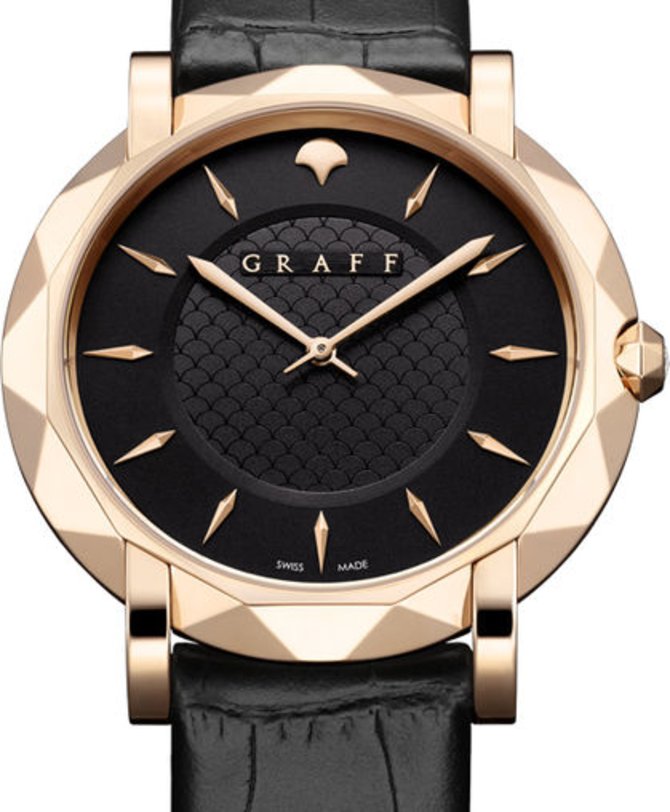 Ювелирно-часовая марка Graff презентует швейцарские наручные часы Star Slim 43 mm Ref. GSU43PGB2 с автоматическим подзаводом, запасом хода на 48 часов работы. Мужские швейцарские часы выпущены в корпусе из золота, диаметром 43 мм. Черный часовой циферблат с элементами гильоширования закрыт надежным и высокопрочным стеклом из сапфирового кристалла. Для фиксации часов на запястье руки в комплекте поставляется ремень из кожи аллигатора и золотая пряжка. Водонепроницаемость корпуса рассчитана на погружение под воду на глубину до 30 метров. Часовые метки и разметка выполнены из золота.