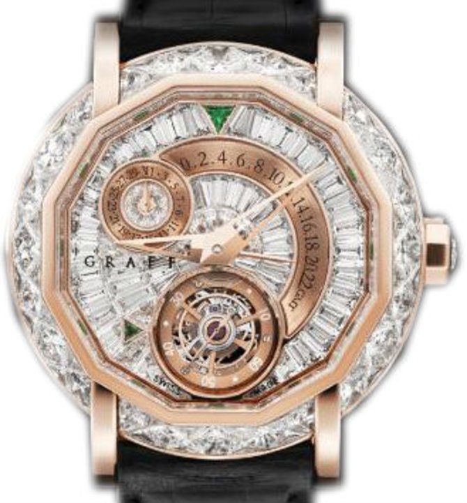 Ювелирные механические часы Technical Double Tourbillon GMT 47 mm Ref. MG47PGDD часовая марка GRAFF представила в корпусе из розового золота, диаметром 47 мм, с инкрустацией бриллиантами классической и багетной огранки. На бриллиантовом циферблате указываются данные текущего времени и второго часового пояса стрелками из золота. Также на циферблате установлено окно турбийона. На руке часы фиксируются ремешком из натуральной кожи аллигатора черного цвета и классической пряжкой из розового золота. Установленный механический механизм Graff отличается запасом хода на 72 часа работы. Циферблат защищен стеклом из натурального сапфирового кристалла с нанесением противобликового состава. Водонепроницаемость корпуса рассчитана на 30 метров. Ограниченная серия - 20 экземпляров.