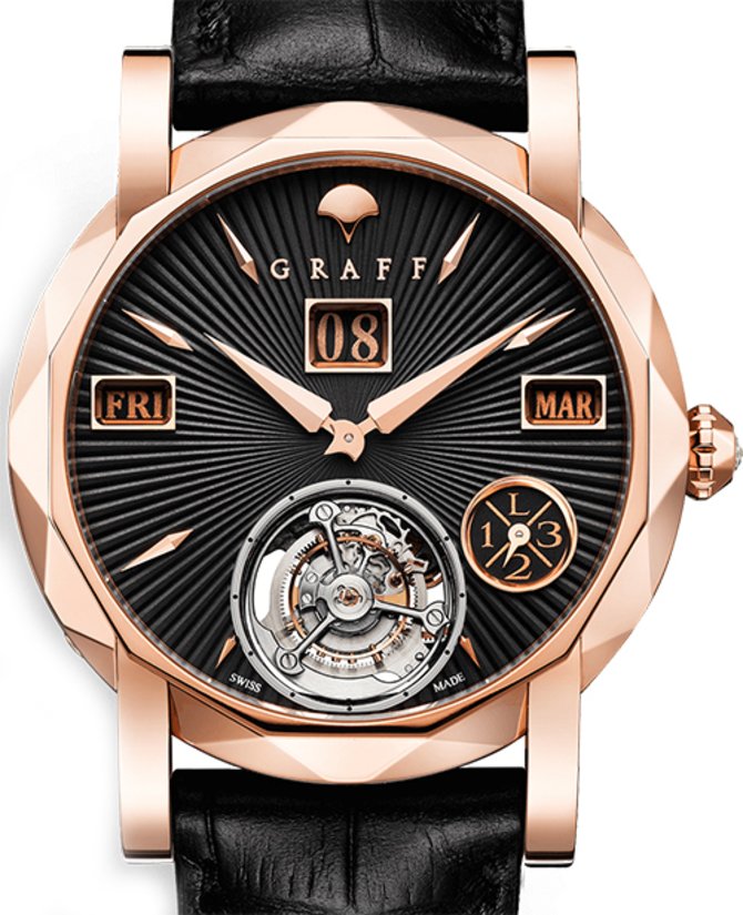 Швейцарские мануфактурные часы от GRAFF, модель Technical Perpetual Calendar 46 mm Ref. MGPCA46PGB, представлены в круглом корпусе из розового 18-каратного золота, диаметром 46 мм. Золотой безель часов - рифленый. Герметичность корпуса составляет 30 метров. На циферблате с гильошированной обработкой указываются текущее время и данные вечного календаря. Модель оснащена турбийоном и вечным календарем. Внутри корпуса размещен мануфактурный механический механизм с запасом хода на 42 часа. Часы поставляются с ремнем из кожи аллигатора черного цвета и застежкой из платины. Циферблат защищает стекло из сапфирового кристалла с противобликовым покрытием.