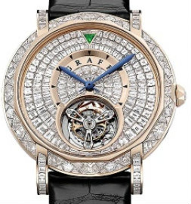 Компания GRAFF презентует швейцарские часы в корпусе из белого золота с инкрустацией бриллиантами классической и багетной огранки - Technical Ultra Flat Ref. MGU43PGDF. На бриллиантовом циферблате, накрытом стеклом из сапфира, воронеными стрелками индицируются часы и минуты. К тому же, на циферблате размещено окошко турбийона. На уровне отметки "12 часов" установлен изумруд. Запас хода механического механизма рассчитан на 72 часа. Ремень пошит из крокодиловой кожи и дополнен золотой застежкой. Корпус обладает 30-метровой водонепроницаемостью.