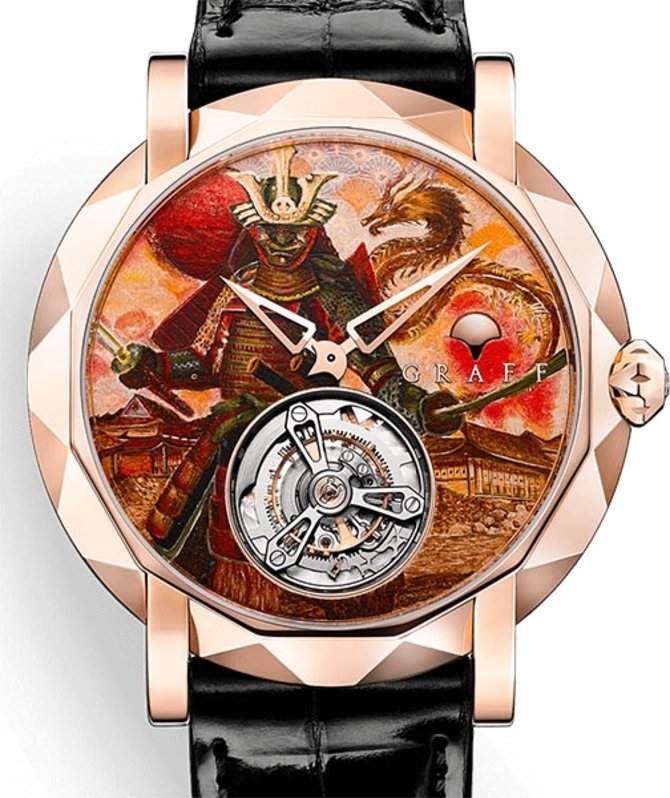 Компания GRAFF презентует швейцарские часы в корпусе из розового золота с художественным эмалевым циферблатом - Technical Metiers dArt Samurai 43 mm Ref. MGU43PGJPSM1. На накрытом стеклом из сапфира циферблате золотыми стрелками индицируются часы, минуты. К тому же, на циферблате размещено окошко турбийона. Запас хода механического механизма рассчитан на 65 часов. Ремень пошит из крокодиловой кожи в черном цвете и дополнен застежкой из розового золота. Корпус обладает 50-метровой водонепроницаемостью.