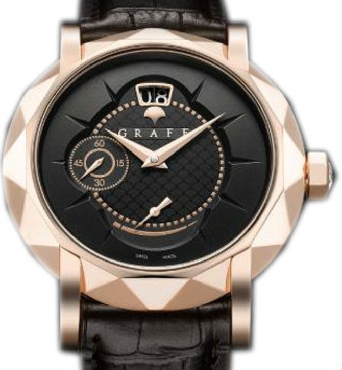 Знаменитая марка GRAFF представила наручные часы Star Grand Date 45 mm Ref. Rose Gold With Black Dial в корпусе из розового золота, диаметром 45 мм. Модель вошла в коллекцию Star. Черный циферблат с золотыми стрелками находится под защитой сапфирового стекла. На уровне отметки "12 часов" размещен индикатор даты. Модель поставляется в комплекте с ремнем из натуральной кожи аллигатора, а также с классической пряжкой из розового золота. Установленный автоматический механизм имеет 50-часовой уровень запаса хода. На циферблате индицируются данные текущего времени, дата и уровень запаса хода. Задняя крышка выполнена из сапфирового кристалла, сквозь которое видна работа механизма. Герметичность корпуса - 30 метров.