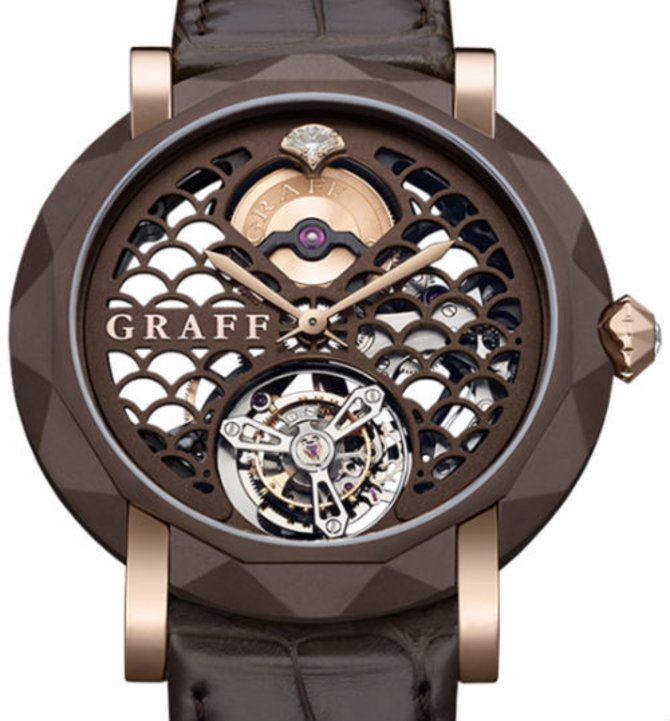 Часовая и ювелирная компания Graff выпустила наручные часы Technical Ultra Flat Icon Skeleton Ref. Chocolate DLC&Rose Gold, которые отличаются функцией турбийона и запасом хода на 70 часов работы. Установленный мануфактурный калибр от инженеров Graff работает от ручного подзавода и служит для индикации часов, минут и секунд. Круглый золотой корпус, размером 43 мм, дополнен ремнем из кожи аллигатора и пряжкой из розового золота. Стрелки, установленные на циферблате, изготовлены из розового золота. Циферблат защищает стекло из натурального сапфирового кристалла. Водонепроницаемость корпуса - 30 метров.