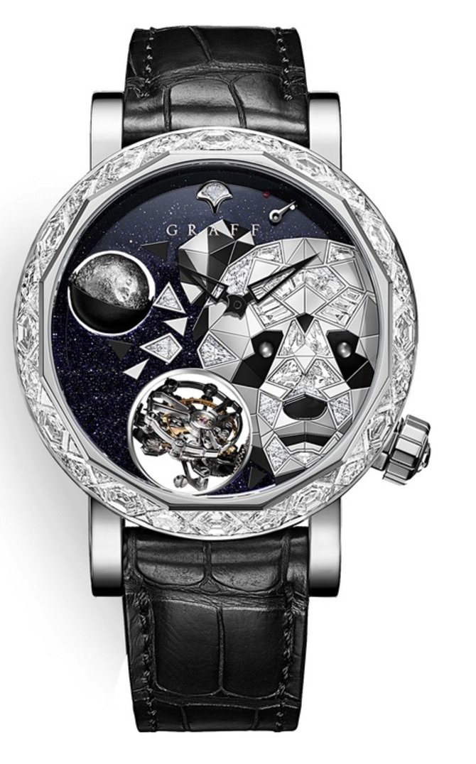 Знаменитый часовой и ювелирный бренд Graff выпустил швейцарские часы GyroGraff Endangered Species 48 mm Ref. MGG48WGDLPA на базе мануфактурного калибра Graff с ручным подзаводом, функцией турбийона, индикаторами запаса хода и фаз Луны. Круглый корпус выполнен из белого золота в размере 48 мм. Часы укомплектованы ремнем из кожи аллигатора и пряжкой из белого золота. Безель инкрустирован белыми бриллианты. Циферблат защищает стекло из натурального сапфирового кристалла с нанесением противобликового покрытия. Задняя крышка выполнена из сапфирового кристалла. Механизм имеет 65-часовой запас хода. Водонепроницаемость корпуса составляет 30 метров.