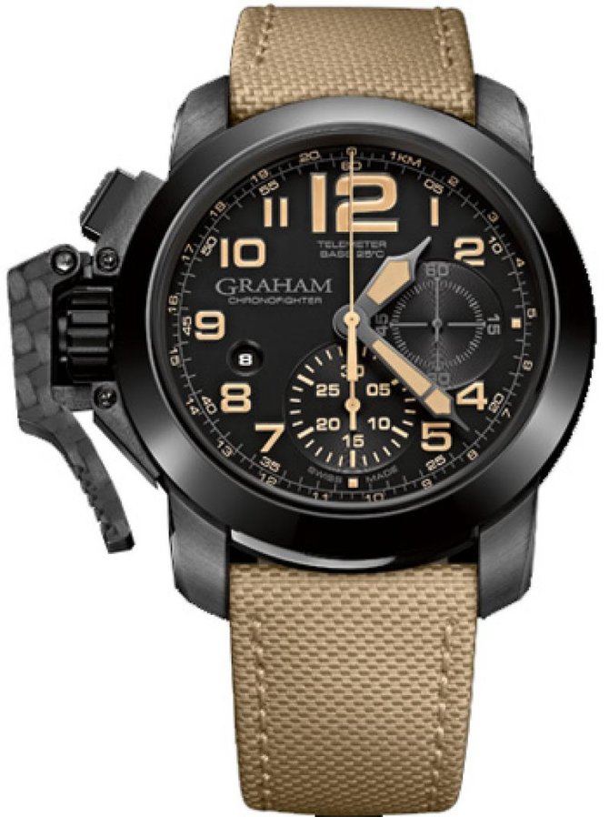 Часовая компания Graham представила новые мужские наручные часы Chronofighter Oversize . Этот хронограф имеет круглый корпус диаметром 47 мм. Он изготовлен из стали с черным PVD покрытием. Корпус модели оснащен керамическим черным безелем. С левой стороны наручных часов располагается большая заводная головка и кнопки хронографа, которые выполнены в форме рычага, карбоновые. На черном циферблате располагаются арабские цифры. Размер цифры «12» значительно отличается от размеров остальных цифр. Часовые стрелки и индексы покрыты люминесцентным веществом бежевого цвета. Небольшая апертура даты находится между цифрами «8» и «9», счетчики хронографа расположены рядом с часовыми метками «3» и «6». Логотип бренда декорирует замечательный циферблат у часовой метки «10». Циферблат защищен выпуклым сапфировым антибликовым стеклом с двух сторон. Сквозь стекло можно наблюдать безупречную работу механизма. Модель Graham Chronofighter Oversize 2CCAU.B02A снабжена автоматическим механизмом G1747 на 25 камнях, с частотой 28 800 полуколебаний в час, запасом хода 48 часов. Калибр оснащен функциями часов, минут, секунд, хронографом и индикатором даты. Водонепроницаемость этих часов составляет 100 метров. Хронографы Graham Chronofighter Oversize 2CCAU.B02A дополнены бежевым ремешком из ткани с черной керамической пряжкой.