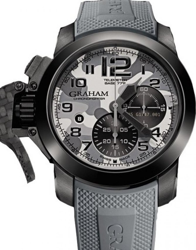 Часы Graham Oversize Black Arrow представлены в корпусе диаметром 47 мм из нержавеющей стали с покрытием PVD, карбоновыми деталями корпуса и керамическим безелем. Часы с функуией хронографа обладают водонерпоницаемостью до 100 метров. На циферблате цвета серого камуфляжа расположились арабские цифры, шкала телеметра, центральные стрелки, апертура даты и накопитель хронографа. Внутри корпуса находится автоматический Калибр G1747 с запасом хода 48 часов. Часы комплектуются серым каучуковым ремешком с узором clous de paris и застежкой из нержавеющей стали.