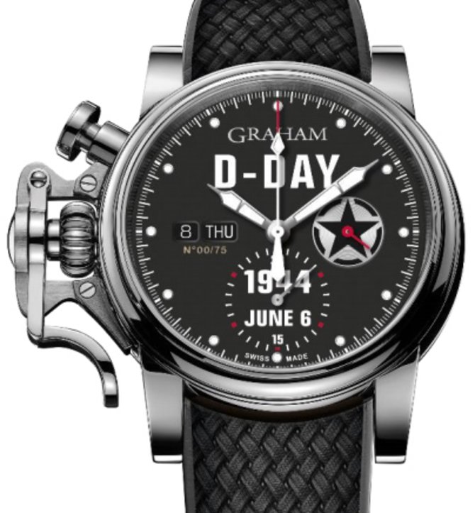 Модель 2CVAS.B30A Chronofighter Vintage D-Day Ltd от швейцарского бренда GRAHAM представлена в крупном корпусе из стали с повышенным уровнем влагостойкости - 100 метров. Круглый корпус, диаметром 44 мм, фиксируется каучуковым ремнем черного цвета и застежкой классического типа из стали. Циферблат, где расположена памятная надпись в честь высадок в Нормандии и штурма союзных войск утром 6 июня 1944 года, защищен сапфировым стеклом. Стрелки для индикации данных покрыты люминесцентным составом. Механизм с автоподзаводом G1747 обладает запасом хода на 48 часов, функцией хронографа, а также индикаторами даты и дней недели. Также на циферблате показываются данные текущего времени. Водонепроницаемость корпуса - 100 метров. Лимитированный тираж - 75 экземпляров.