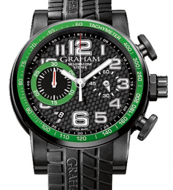 Корпус из нержавеющей стали c PVD покрытием, диаметр 44 мм, Calibre G1702, автоматический хронограф, 59 камней, балансовая частота 28 800 пк/час, противоударная система Incabloc, запас хода 40 часов, дымчатое сапфировое стекло с двойным антибликовым покрытием, интегрированный черный ремешок из каучука напоминающий протектор шины. Спортивный черный циферблат украшен белыми цифрами, а также стрелками с люминисцентным покрытием зеленым счетчиком хронографа.