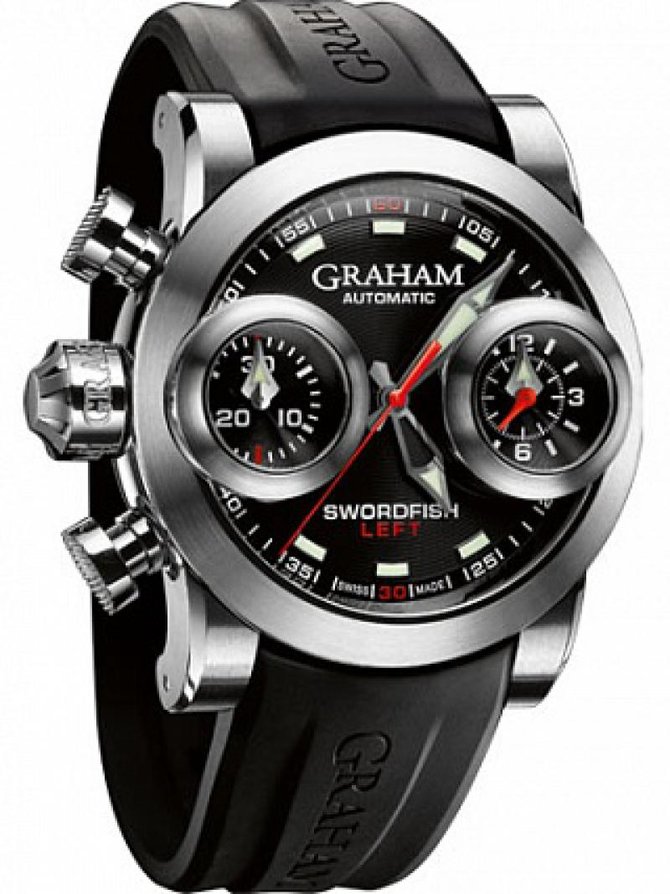На создание модели Swordfish мастеров GRAHAM вдохновила... рыба-меч! Неимоверная проворность и стремительность делает рыбу-меч опасным, сильным бойцом. «Длинный меч» на голове рыбы может протыкать насквозь прошивку лодок. И уж, конечно, рыбу-меч нельзя назвать паинькой. С часами Swordfish Вам не удастся быть на вторых ролях. Хронограф с 30-минутным и 12-часовым счетчиками оснащен автоматическим механизмом, Калибр G 1710, который обеспечивает запас хода до 48 часов. Часы представлены в 48-миллиметровом корпусе из нержавеющей стали. Водонепроницаемость составляет 100 метров. Модель поставляется на каучуковом ремешке с вставкой из нержавеющей стали.