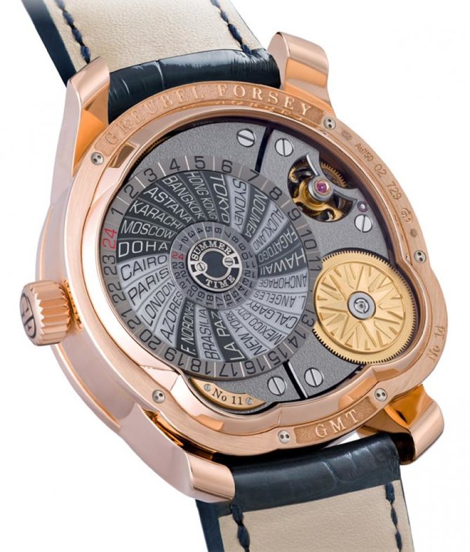 Известная во всем мире компания Greubel Forsey, представляет великолепную модель часов GMT, Greubel Forsey. Данная модель отличается четким классическим шикарным дизайном, функциональностью и в тоже время простотой. Функциональность модели подчеркивает наличие турбийона и функции двойного времени. Указатель часовых поясов выполнен в виде настоящего трехмерного глобуса, что бы интуитивно понимать время. Причём глобус смотрит на вас Северным полюсом, поэтому сбоку корпуса сделано окошко, чтобы можно было разглядеть и Южное полушарие. Черно-белая шкала вокруг планетки из титана показывает разницу во времени между солнечной и тёмной сторонами планеты, и совершает полный оборот за одни сутки, т.е. в точности повторяет движение Земли. Ещё одна особенность новинки — запатентованный турбийон, установленный под наклоном в 25°. Он совершает полный оборот за 24 секунды, состоит из 87 деталей и весит всего 0,36 г. В отличии от прошлой модели, он расположен не на 8-и часах, а на 4-х, это говорит о новом механизме.