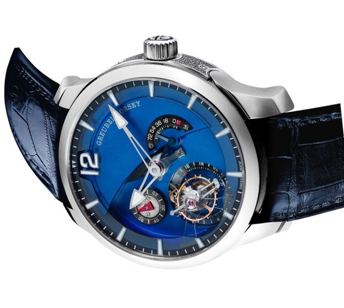Производитель часов Greubel Forsey, известен на весь мир не перестает удивлять своими великолепными шедеврами. Этому свидетельствует модель часов Tourbillon 24 Secondes Contemporain Pt из коллекции Tourbillon 24 Secondes. Хочется отметить трехмерный дизайн данной модели, который привлекает настоящих ценителей искусства. Корпус данного чуда выполнен из платины 950-ой пробы. Механизм в целом выполнен из 268 компонентов. Корпус закрывают сапфировые антибликовые стекла, которые не дадут поцарапать данную модель. А благодаря задней прозрачной сапфировой крышке, открывается взгляд на работу точного механизма. К слову сказать размеры корпуса составляют 43.5 х 15.2 мм. Основные функции модели это часы, минуты, секунды, запас хода, но главная особенность это хронометр и турбийон. Стрелки скелетонизированные "ходят" по благородному синему циферблату. Они отлиты из вороненной стали вручную. Синий ремешок цветовой гаммой как раз ложится под цвет циферблата. Сделан из кожи крокодила, оснащен вставкой из платины. Благодаря запасу хода, который составляет 72 часа, можно не беспокоится о подзаводе. Водонепроницаемость модели составляет 30 метров, что вполне характерно для часов коллекции Tourbillon 24 Secondes. К сожалению серия данной модели ограничена всего лишь в 33 экземпляра.