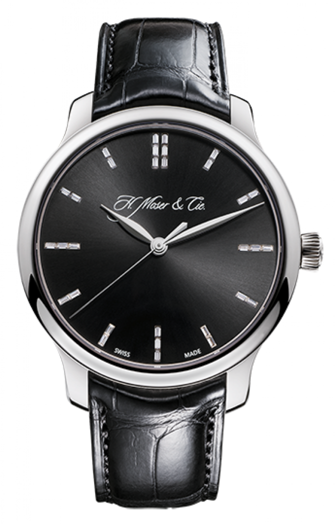Генрих Мозер появился на свет в 1805 году в швейцарском городе Шаффхаузене. Он имеет непосредственное отношение к целой династии часовщиков и, конечно же, сам являлся часовых дел мастером. Когда Мозеру было 22 года, он переехал в Россию, где в скоре разработал целую часовую империю, которую назвал «H. Moser & Cie». Новая экстраординарная модель швейцарских наручных часов "ENDEAVOUR CENTRE SECONDS, WHITE GOLD, BLACK DIAL WITH DIAMOND BAGUETTES" от Н.Moser представлена в полированном корпусе круглой формы, выполненном из белого золота; диаметр корпуса - 40.8 мм. Механизм с ручным заводом, 7-ми дневным запасом хода и балансовой частотой - 18 000 полуколебаний/час. На черном циферблате размещены индикаторы часов, минут и секунд. Роль часовых меток выполняют белые багетные бриллианты. Все часовые компоненты выполнены с ручной отделкой. Благодаря просвещающейся задней крышке из сапфирового стекла можно любоваться механизмом представленной модели. Часы комплектуются черным ремешком из крокодильей кожи. Классическая застежка произведена из белого золота с нанесением на нее гравировки в виде официального логотипа компании H. Moser. На заводной головке также выгравирована эмблема компании-производителя представленных часов.