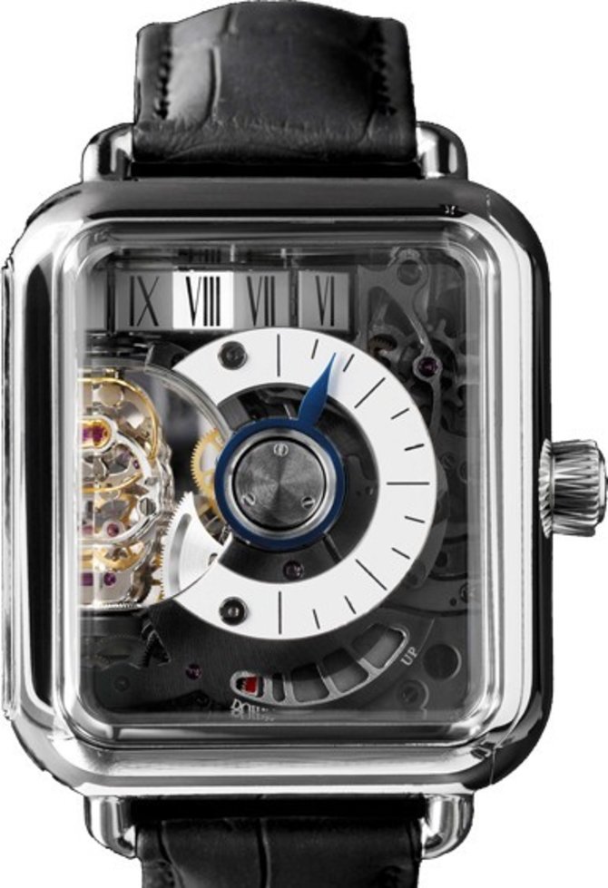 Швейцарские часы Swiss Alp Watch Minute Retrograde 5900-0200 от часовой торговой марки H. Moser & Cie представлены в корпусе из 18-каратного белого золота, диаметром 48 х 42 х 18.3 мм, который фиксируется на руке ремешком из натуральной кожи аллигатора с пряжкой из белого золота. На уникальном скелетонированном циферблате, закрытом стеклом из сапфира, устойчивым к царапинам, показываются часы, минуты и запас хода механизма. В часах установлен автоматический механизм от инженеров H. Moser & Cie. Задняя крышка из сапфирового стекла показывает работу механизма. Водонепроницаемость корпуса - 30 метров. Модель выпущена в 2019 году. Часы комплектуются ремешком из натуральной кожи крокодила черного цвета и застежкой из белого золота для фиксации аксессуара на руке.