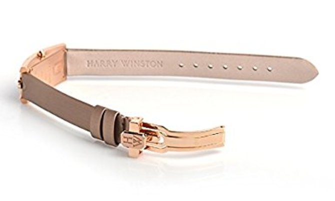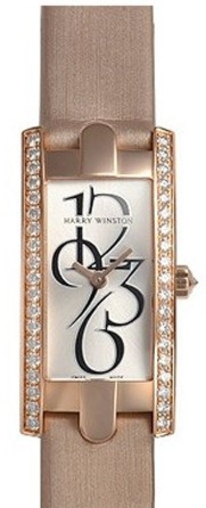 Швейцарские часы Avenue C Mini Art Deco в золотом прямоугольном корпусе, декорированном бриллиантами, представлены брендом Harry Winston. На светлом циферблате с крупными, переплетенными между собой, цифрами, указываются данные часов и минут. Циферблат накрыт сапфировым стеклом. В комплекте к модели идет ремешок телесного цвета, выполненный из текстильных материалов. Рифленая заводная головка, с помощью которой меняются данные текущего времени, выполнена из золота. Водонепроницаемость корпуса - 30 метров. Стрелки также золотые. Застежка сделана из розового золота. На ней из золота вылит логотип бренда Harry Winston. Установленный внутри часов механизм кварцевый, мануфактурного производства компании Harry Winston.