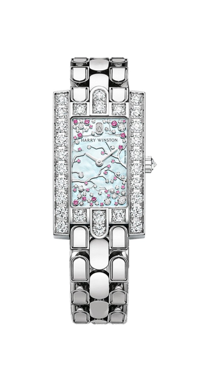 Швейцарская часовая мануфактура HARRY WINSTON представила ювелирные часы Avenue Ref. AVEQHM21WW287 на базе кварцевого мануфактурного калибра HW1044, который обеспечивает индикацию времени стрелками из белого золота на инкрустированном бриллиантами и розовыми сапфирами циферблате. Циферблат от повреждений защищен стеклом из сапфирового кристалла с противобликовым составом. Корпус прямоугольной формы и браслет с раскладной застежкой выполнены из белого золота. Безель корпуса инкрустирован бриллиантами классической огранки. Корпус обладает 30-метровой влагостойкостью. Часы выпущены в 2019 году.
