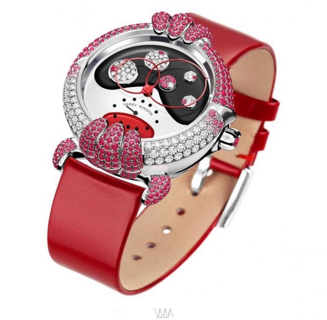 Эти композиции еще более усиливаются использованием дополнительных декораций на циферблате, как например, модель Harry Winston High Horology Diane поставляется в круглом корпусе из белого золота, размером 28 мм, оснащена механизмом с автоподзаводом и поставляется на кожаном ремешке красного цвета.