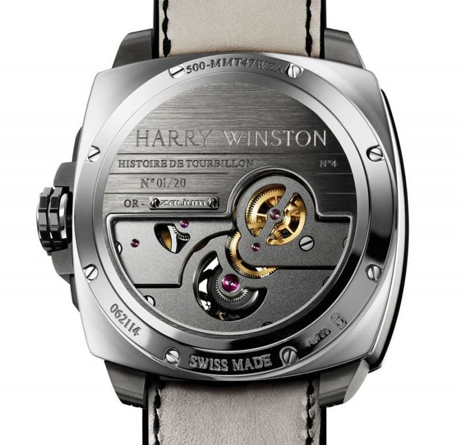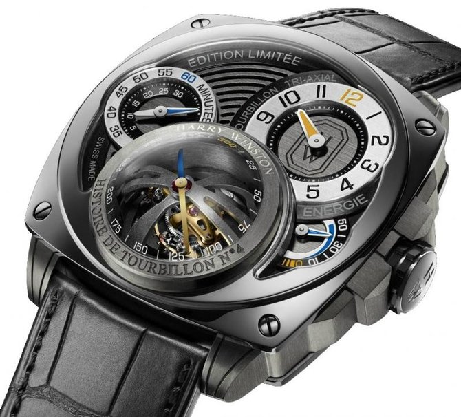Известная на весь мир американская компания Harry Winston, которая специализируется на изготовлении великолепных часов, а также ювелирных изделий, и берет свое начало в далеком 1932 году, представляет Вашему вниманию очередную модель мужских наручных часов Haute Horology Histoire de Tourbillon HCOMDT47WZ001 из коллекции Haute Horology. Данная модель будет интересна любителям строгих неординарных дизайнов, подчеркивающие оригинальный стиль, а также функциональных устройств. Корпус круглой формы отполирован до блеска, выполнен из белого восемнадцати каратного золота, его размер составляет 48.5 мм в диаметре. Основные функции часов это часы, минуты, секунды, но главную функциональную часть, выполняет здесь турбийон. Механизм часов с ручным заводом, оснащен калибром HW4501, имеет запас хода на 50 часов. Циферблат часов серебристо-черного цвета. Браслет часов черного цвета, выполнен из кожи аллигатора, оснащен откидной золотой застежкой. Стрелки которые находятся на циферблате, отлиты вручную из вороненной стали. Прочное сапфировое стекло закрывает корпус, а задняя крышка находится под давлением. Водонепроницаемость модели составляет 30 метров. Заводной ключ находится на позиции трех часов. Серия данной модели ограничена всего в 20 экземпляров.