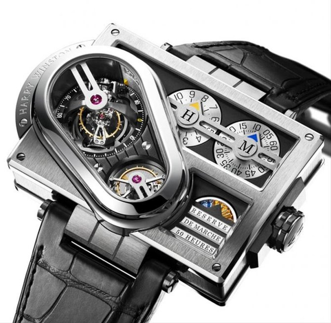 Известная на весь мир американская компания Harry Winston, которая специализируется на изготовлении великолепных часов, а также ювелирных изделий, и берет свое начало в далеком 1932 году, представляет Вашему вниманию очередную модель мужских наручных часов Haute Horology Histoire de Tourbillon HCOMTT65WZ001 из коллекции Haute Horology. Данная модель будет интересна любителям неординарных дизайнов, подчеркивающие оригинальный стиль, а также функциональных устройств. Корпус сложной формы отполирован до блеска, выполнен из белого восемнадцати каратного золота и залиума, его размер составляет 65 х 45.9 мм. Основные функции часов это часы, минуты, секунды, запас хода, но главную функциональную часть, выполняет здесь турбийон. Механизм часов с ручным заводом, оснащен калибром HW4501, имеет запас хода на 50 часов. Циферблат часов серебристого цвета, что подчеркивает элегантность изделия. Браслет часов черного цвета, выполнен из кожи аллигатора, оснащен откидной золотой застежкой. Стрелки которые находятся на циферблате, отлиты вручную из вороненной стали. Прочное сапфировое стекло закрывает корпус, а задняя крышка находится под давлением. Водонепроницаемость модели составляет 30 метров. Заводной ключ находится на позиции трех часов. Серия данной модели ограничена всего в 20 экземпляров.