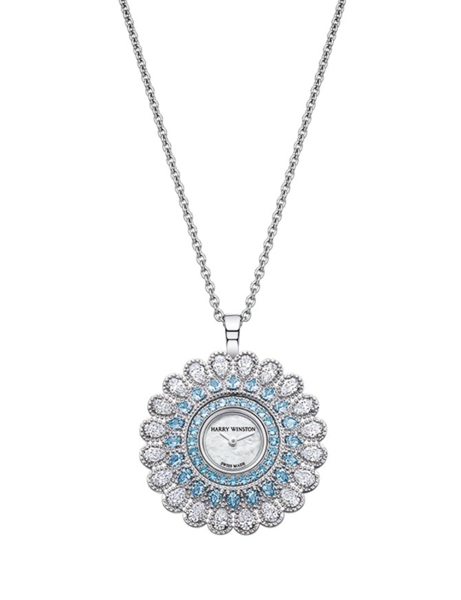Ювелирные универсальные часы HARRY WINSTON Haute Jewelry Marquise Time (Ref. HJTQHM36WW001) представлены в круглом корпусе из белого золота с украшением драгоценными камнями - бриллиантами и аквамариновыми камнями. Диаметр корпуса - 36.5 мм. Кварцевые часы оснащены мануфактурным механизмом HW1051 для индикации текущего времени. Циферблат выполнен из натурального морского перламутра. Стрелки сделаны из белого золота. В комплекте с моделью идет ремень из сатина для фиксации часов на руке, а также цепочка для использования аксессуара в качестве подвески. Герметичность корпуса рассчитана на 30 метров.