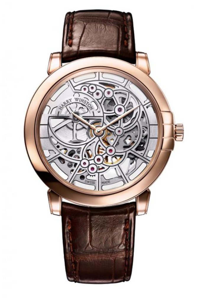 Известная на весь мир американская компания Harry Winston, которая специализируется на изготовлении великолепных часов, а также ювелирных изделий, и берет свое начало в далеком 1932 году, представляет Вашему вниманию очередную модель мужских наручных часов Midnight Skeleton 450/MAS42RL.W из коллекции Midnight. Данная модель будет интересна любителям необычных классических дизайнов, подчеркивающие оригинальный стиль, а также функциональных устройств. Корпус круглой формы отполирован до блеска, выполнен из розового золота в восемнадцать карат, его размер составляет 42 х 7.5 мм. Основные функции часов это часы, минуты. Механизм часов автоматический, имеет запас хода на 42 часа. Циферблат часов серебристого цвета, гильошированный, что подчеркивает элегантность изделия. Браслет часов коричневый, выполнен из кожи аллигатора, оснащен откидной золотой застежкой. Стрелки которые находятся на циферблате, отлиты вручную из вороненной стали. Прочное сапфировое стекло закрывает корпус, а задняя крышка находится под давлением. Водонепроницаемость модели составляет 30 метров. Заводной ключ находится на позиции трех часов. Еще одна, пожалуй самая главная особенность модели, это циферблат скелетон.